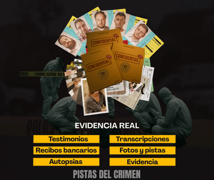 Pistas clave: fotos, cartas, mensajes y objetos relevantes al caso.